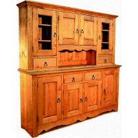Комплект из нижней тумбы и верхнего буфета выполнен в стиле Прованс. В нижней части отлично разместятся соленья-варенья, посуда и скатерти. За стеклянными дверцами можно хранить праздничные сервизы, семейные раритеты, интерьерные вещицы.  Задние стенки всех буфетов набраны из дощечек массива сосны. Также из массива сосны набраны днища ящиков. В конструкции нет элементов из фанеры, ДСП, или МДФ.