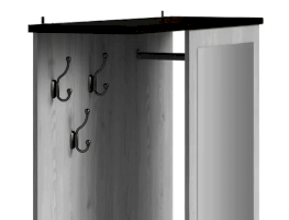 Шкаф разделен на 3 отделения: отделение с крючками для навешивания одежды, отделение со стационарной металлической штангой для одежды и отделение с полкой за откидной дверью