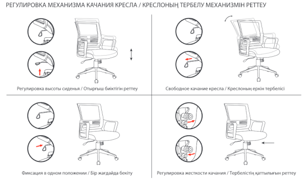 Кресло оснащено механизмом качания «топ-ган» с регулировкой под вес пользователя и возможностью фиксации спинки в рабочем положении.