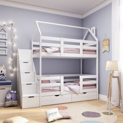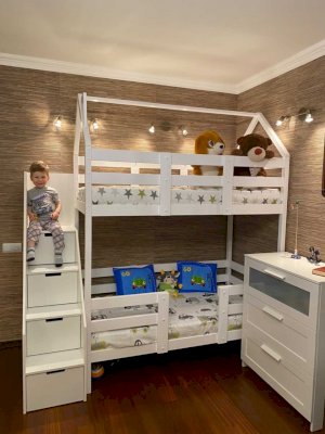 Детская двухъярусная кроватка-домик Classic из сосны с лестницей-комодом из качественного ЛДСП — это лаконичный дизайн, безопасные материалы и краски, качественное исполнение, простота в сборке! Лестница-комод устанавливается с торца кровати и обеспечивает помимо удобного входа на второй этаж кучу места для хранения в выдвижных ступенях-ящиках. Сборка не универсальная - только как на фото.