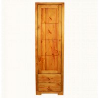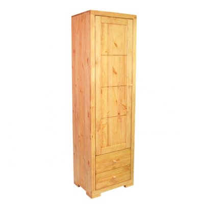 Этот однодверный шкаф имеет четыре полки за дверью. В нижней части витрины расположены два ящика с плавным механизмом выдвижения. Эта простая и удобная конструкция в силу своей лаконичности будет всегда популярна и актуальна. Массив сосны, из которого изготовлена витрина, позволит мебели сохранить свои высокие эксплуатационные свойства и безупречный внешний вид на протяжении многих лет.