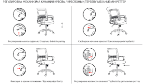 Кресло оснащено механизмом качания «топ-ган» с регулировкой под вес пользователя и возможностью фиксации спинки в рабочем положении.