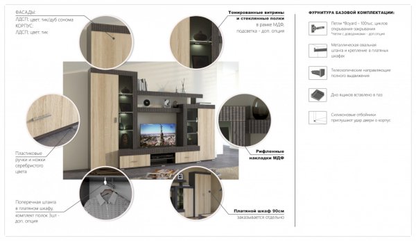 Марк - это готовое решение для гостиной и спальни в современном европейском стиле.Благодаря тщательно продуманной конструкции и правильному подбору цветов, позволяет создать уютную и теплую обстановку для отдыха и содержания дома в порядке.Отличительные особенности: утолщенные линии из рельефного МДФ, тонированные витрины со стеклянными полками, множество места для хранения при небольших размерах.Дополнительно комплектуется светодиодной подсветкой и платяным шкафом.