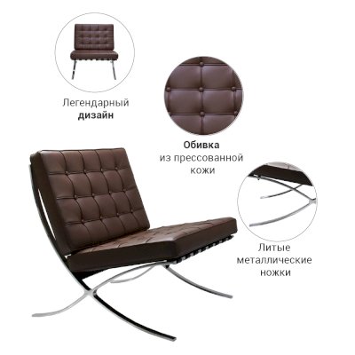 Классика современного дизайна Кресло и Оттоманка Barcelona, созданные Людвиг Мис ван дер Роэ в 1929 для Всемирной Выставки в Барселоне. Кресло в производстве почти 80 лет и по-прежнему остается иконой дизайна, «обязательной» частью в домах и офисах ценителей искусства,  архитекторов и дизайнеров. Производимое по первоначальными спецификациям, кресло Barcelona продолжает быть олицетворением стиля. Этот предмет современного искусства идеально дополнит вашу гостиную, кабинет, зону отдыха, спальню или офис.