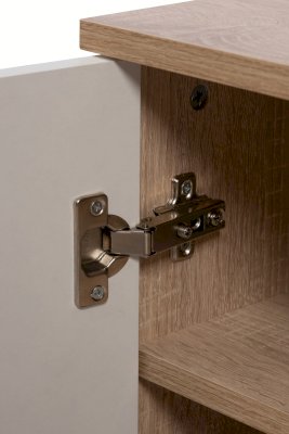 Данная модель имеет закрытую створкой нишу с двумя полками. Створка закреплена на петли с доводчиками для плавности хода и бесшумного закрывания. Для удобного открывания тумба оборудована механизмом «push-to-open».