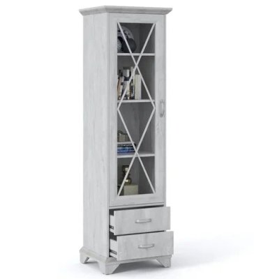 Пенал-витрина добавит уюта в интерьер гостиной в стилях неоклассика или прованс. Белые рамочные фасады с фактурой и рисунком натурального дерева, декоративные крестообразные накладки, фигурные ножки и карниз все это придает комнате элегантный и светлый вид. За прозрачным фасадом можно расположить предметы декора, красивый сервиз или книги. Выдвижные ящики на телескопических направляющих предназначены для хранения различных вещей. Мебель выполнена из экологичных материалов.