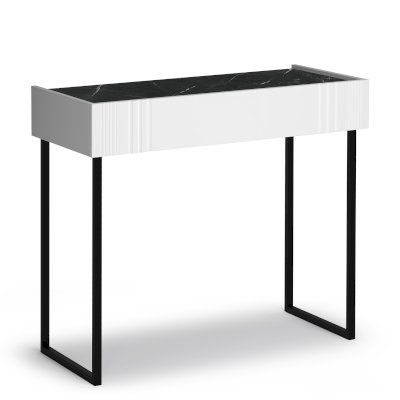 Модель имеет яркий и лаконичный дизайн. Столик изготовлен в виде консоли на высоких опорах в стиле лофт. Его конструкция включает широкий выдвижной ящик, который справится с задачей хранения всевозможных мелочей, косметики и аксессуаров.