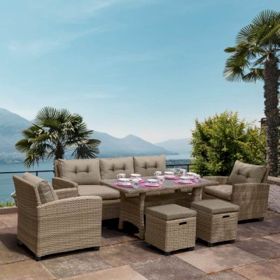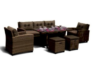 В составе комплекта: трехместный диван, стол с декингом, 2 кресла и 2 пуфа. Высококачественная лоза из полиротанга бежевого цвета стойкая к любым атмосферным явлениям. Крепкий стальной каркас с полимерным антивандальным покрытием и отличным качеством сварки. Изделие сплетено вручную нашими мастерами под жестким контролем качества на каждом этапе производства. Лоза максимально приближена по рельефу и текстуре к естественному материалу. Идеально подходит для использования на улице и внутри помещения в любую погоду. Не боится воды, солнца и минусовой температуры.