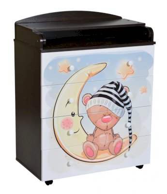 Пеленальный комод 800/4 Lilu 7 отличается привлекательным дизайном с использованием тематических детских принтов. В конструкции изделия предусмотрены 4 маленьких передвижных колеса, несколько вместительных ящичков на шариковых направляющих и откидывающаяся пеленальная столешница. Детский пеленальный комод, декорированный красочным рисунком, вмещает в себя постельные принадлежности, средства гигиены, распашонки, подгузники, игрушки, ползунки и другие личные вещи ребенка. Гладкая столешница идеально подходит для пеленания ребенка, а колесики позволяют быстро перемещать комод.