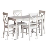 Стильный обеденный комплект Хадсон из Дельфийской коллекции идеально дополнит интерьер вашей кухни или столовой. Обеденная группа будет отлично смотреться в гостиной, кухни или столовой создавая в комнате атмосферу спокойствия и комфорта. Каркас стола классической прямоугольной формы и основание стульев выполнены из массива тополя - прочной и долговечной древесины. Столешница изготовлена из МДФ, она не требует специального ухода, не деформируется при изменении температуры и попадания влаги. Стол и стулья в белом цвете (white) будут стильно смотреться в вашем интерьере.