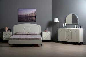 Кровать установлена на высокие ножки, что делает конструкцию лёгкой и воздушной, изголовье кровати декорировано фрезеровкой. Матрас укладывается на ортопедическое основание с гнутоклееными ламелями.