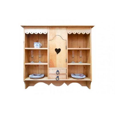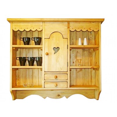 Классический навесной шкаф из прованской коллекции. Шкаф удобен для хранения посуды, салфеток, бокалов. Он прекрасно сочетается с другими элементами коллекции. По бокам - две открытые ниши, в центре шкафа дверь с полкой и два малых ящика.