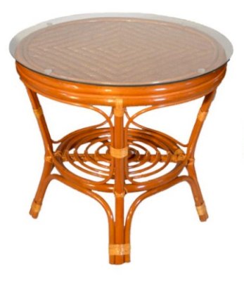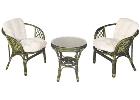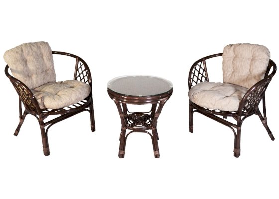 Комплект из натурального ротанга, состоящий из двух кресел и круглого столика с плетеной столешницей. Стекло входит в комплект.