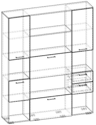 Применение задней стенки из ЛДСП (в ячейках с ящиками и фасадами) позволяет использовать данный стеллаж для зонирования пространства (чтобы предотвратить опрокидывание, необходимо обеспечить крепление стеллажа к стене).