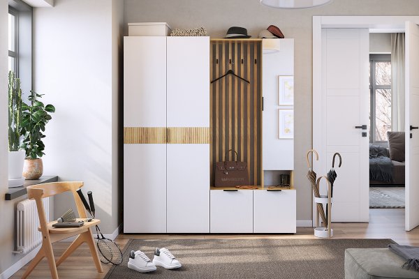 Стильные, трендовые рейки МДФ, акцентные крючки, зеркало, в котором можно себя увидеть в полный рост, полки для мелочей и головных уборов, а так же внузу большой шкаф для обуви, самые актуальные и ценные моменты для прихожей.
