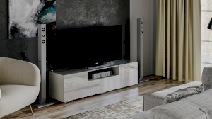 Тумба ТВ оснащена открытой полкой, выдвижным ящиком и широкой поверхностью подставки под телевизор. Дверные фасады боковых отсеков оборудованы накладными петлями с доводчиками, что обеспечивает плавное бесшумное закрытие.